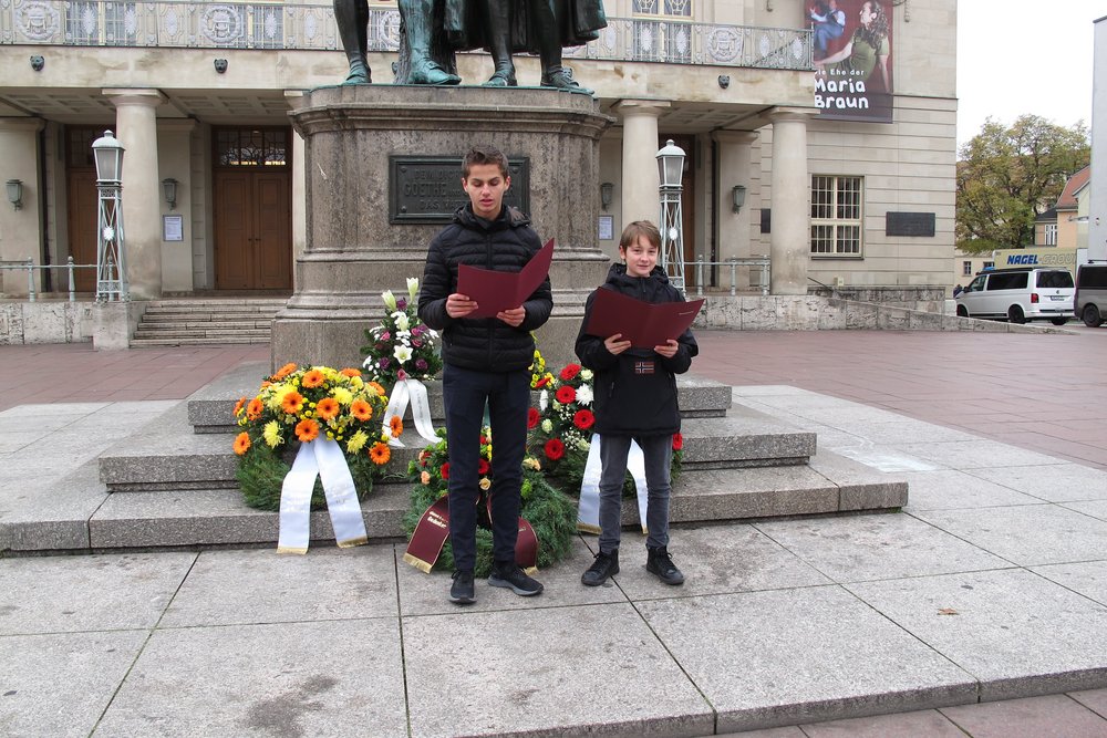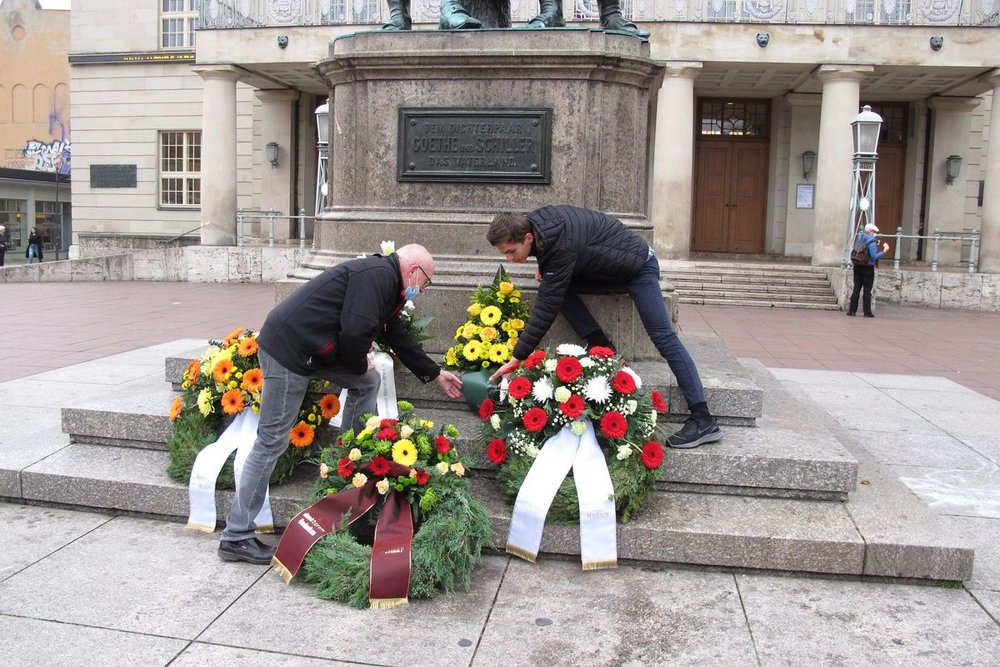Wir sind nicht die Einzigen, die Schiller zu seinem 261-jährigen gratulieren. Auch Kränze von den Städten Weimar und Marbach, dem Marbacher Schillerverein und dem Schillerverein Weimar-Jena, von dem auch ein paar Vertreter da sind, sind platziert.
