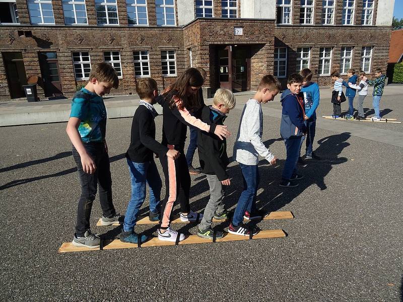 Danach ist die Hälfte der Klasse mit ihr auf den Schulhof gegangen und wir haben Gemeinschaftsspiele gespielt. Bei dem 1. Spiel hatten drei bis vier Kinder gemeinsam ein 2m langes Holzbrett, mit dem man im Gleichschritt laufen musste, dens sonst wären alle Kinder zu Dominosteinen geworden.