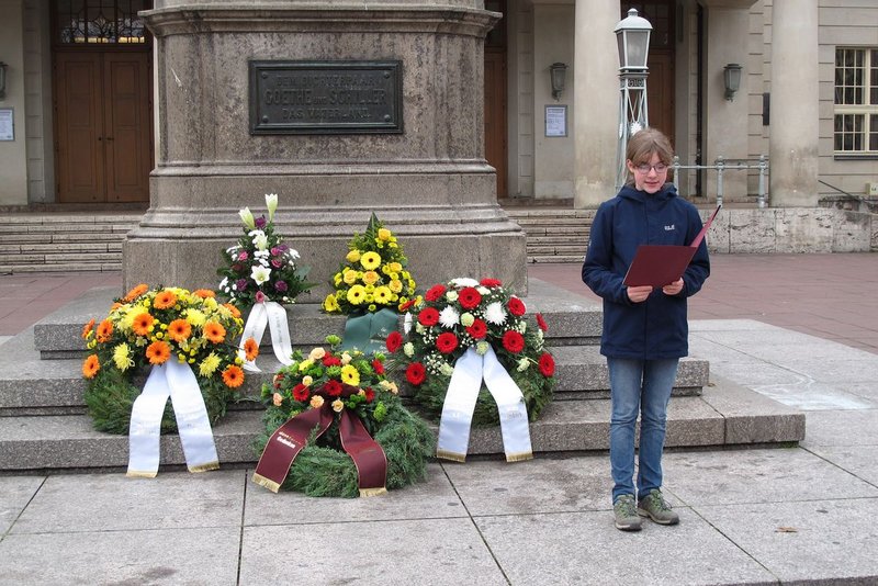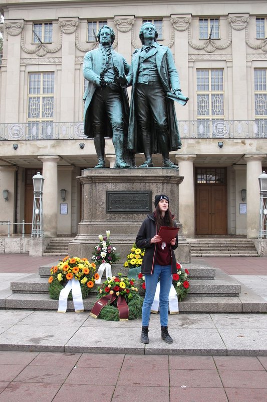 Wir sind nicht die Einzigen, die Schiller zu seinem 261-jährigen gratulieren. Auch Kränze von den Städten Weimar und Marbach, dem Marbacher Schillerverein und dem Schillerverein Weimar-Jena, von dem auch ein paar Vertreter da sind, sind platziert.