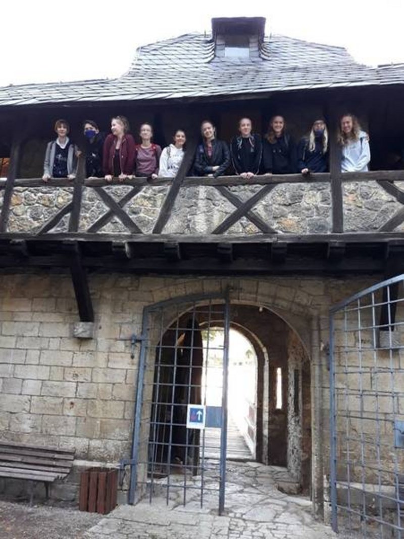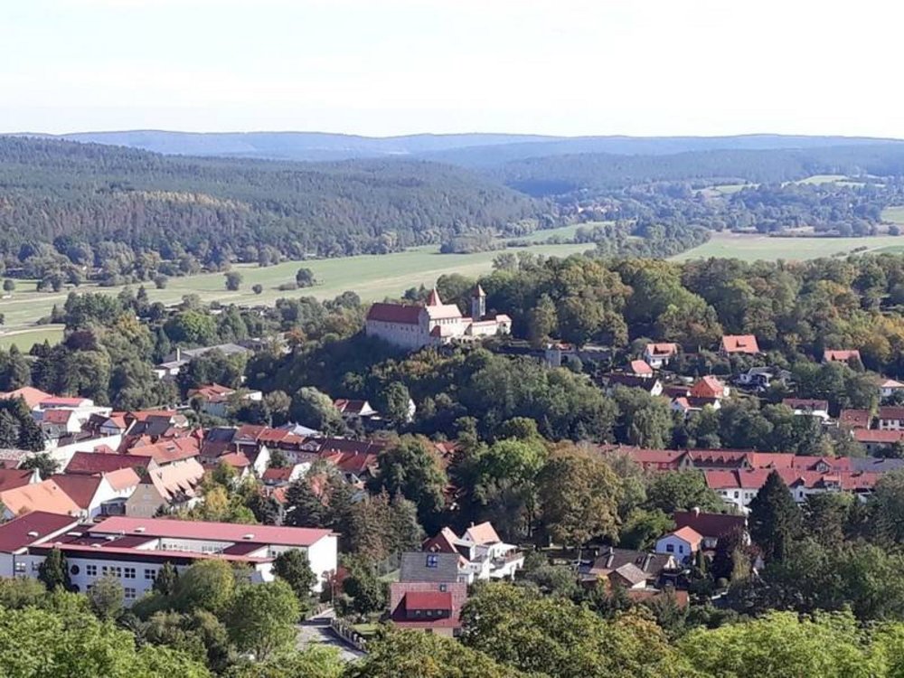Um 8:40 Uhr haben wir uns am Hauptbahnhof getroffen. Wenig später sind wir in den Zug nach Kranichfeld eingestiegen. Nach einigen Haltestellen sind wir nach einer ca. 50-Minuten-Fahrt angekommen. Vom Kranichfelder Bahnhof sind wir ein kurzes Stück durch die Landschaft gelaufen, bis wir nach einem steilen Anstieg auf dem Oberschloss Kranichfeld angekommen sind. Oben angekommen legten wir erst einmal eine kleine Frühstückspause ein. Vielen Dank an dieser Stelle an Herrn Schmidt, der uns leckeren selbstgebackenen Kuchen und Tee gebracht hat.